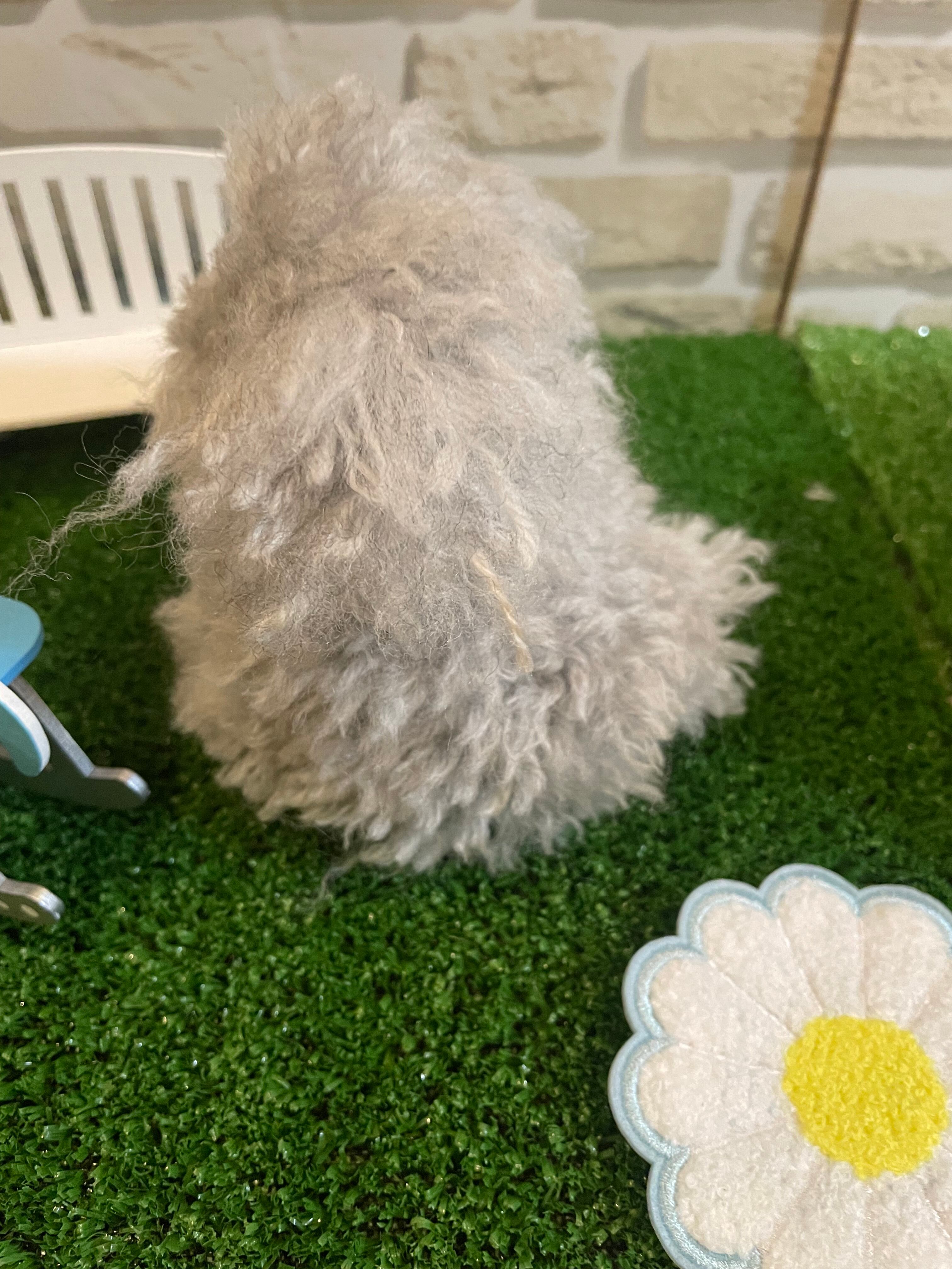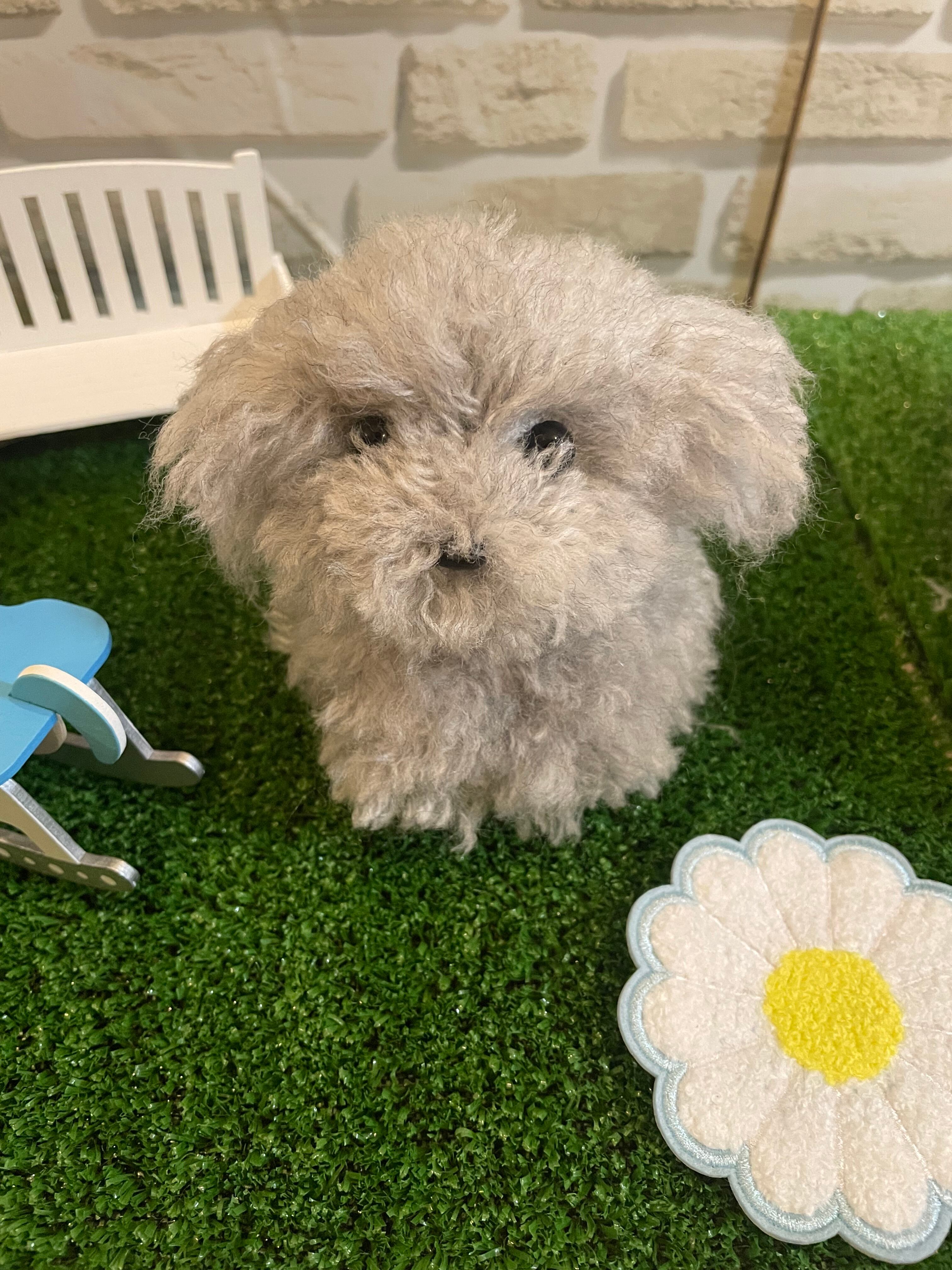このトイプードルちゃんは、ふんわりとしたグレーの被毛が特徴で、かわいらしいお座りポーズが魅力的です。まるで本物のわんちゃんがそこにいるかのようなリアルさを感じられ、見る人に癒やしをもたらす特別な存在です。お部屋に飾ることで、愛らしい雰囲気を演出し、贈り物としても喜ばれることでしょう。手作りの温もりを感じられるトイプードルちゃんは、あなたの生活空間に心温まるひとときを添えてくれるでしょう。